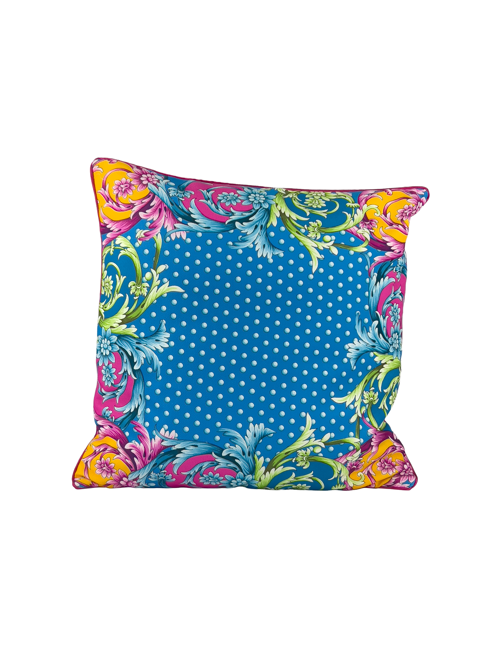 Capri Dots, mavi zemin üzerine beyaz puantiyeler ve etrafını saran rengarenk çiçek motifleriyle modern-retro bir karakter sunar.